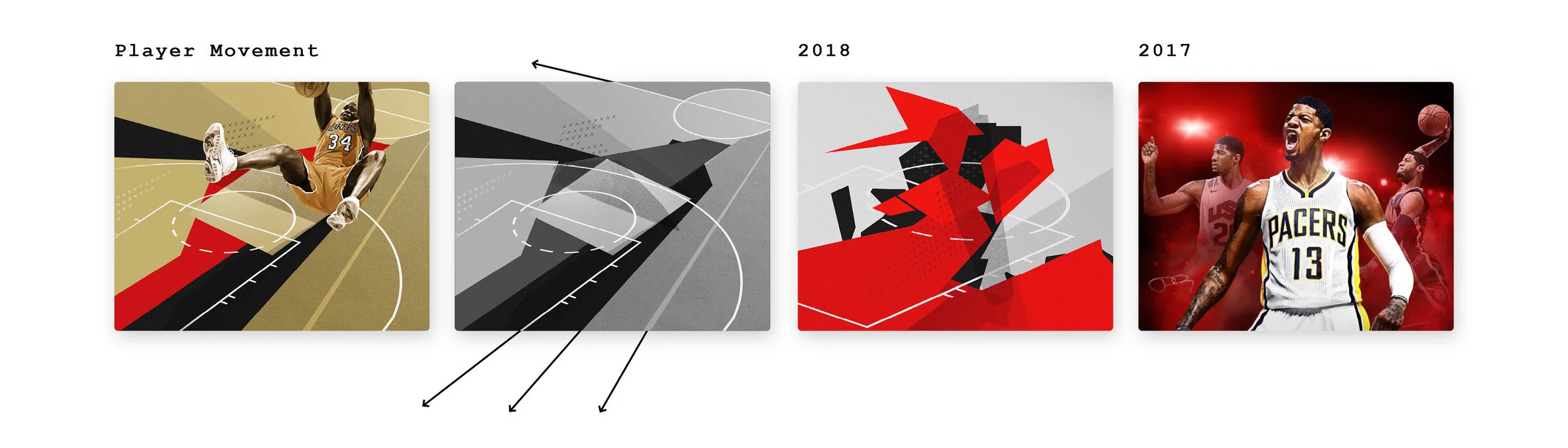 The goal for the 2018 covers was to introduce a cleaner and more graphic aesthetic across the NBA2K brand. Almost a complete 180˚ from past covers, the new design is more eye catching, with brighter colors and sharper graphics. This new design was also partly introduced to increase the brand’s presence and recognition during in-store and online consumer interactions.